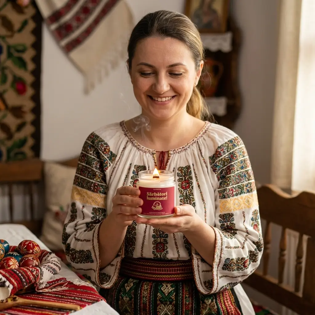 Ceara de soia arde curat, fără fum, iar lumânarea vine cu mesajul „Sărbători Luminate!” pe etichetă, într-un borcan de sticlă care arată frumos oriunde o pui. Pe masă, lângă icoane, sau cadou pentru cineva care merită un Paște parfumat. E genul de lumânare de Paște pe care o aprinzi o dată și o tot cauți an de an.