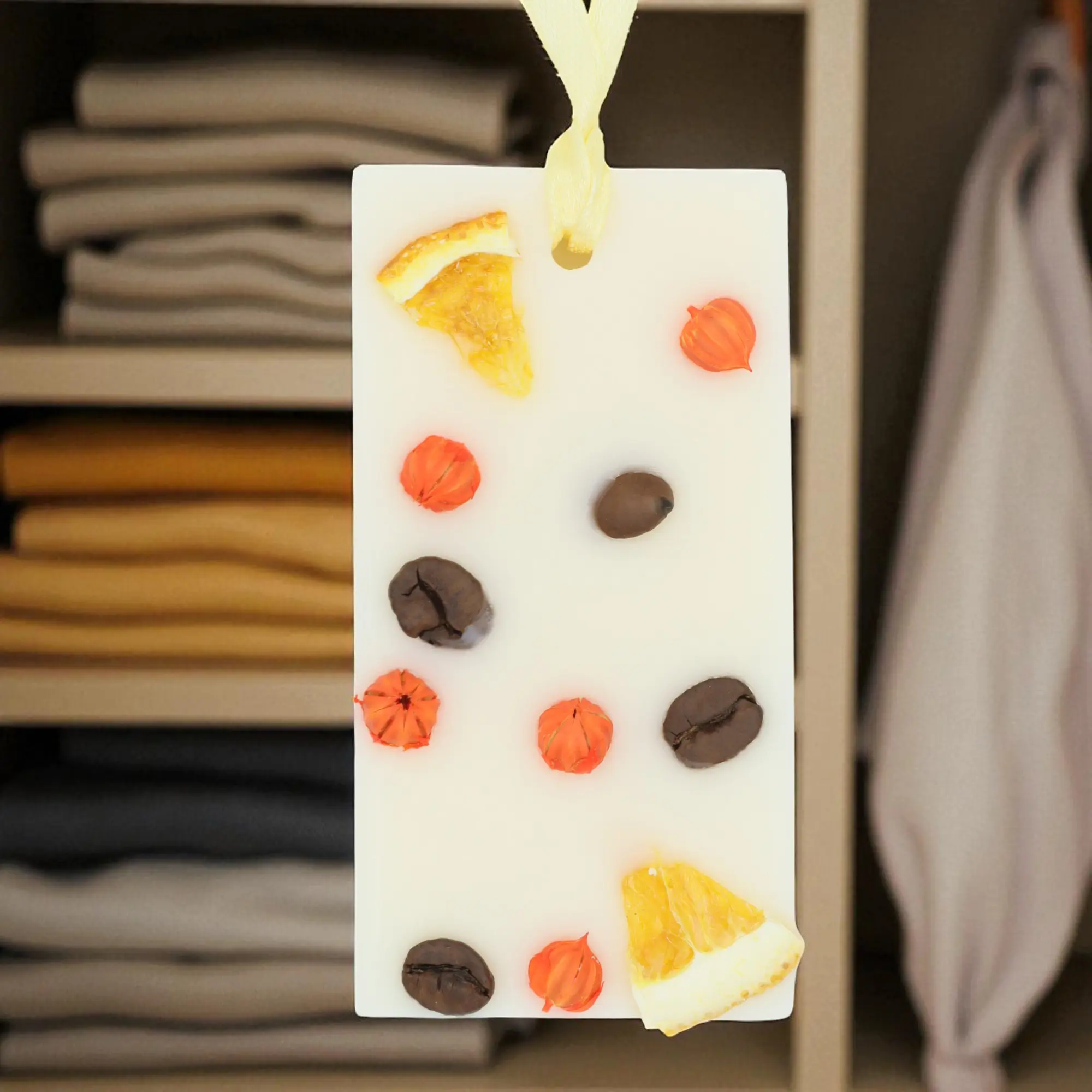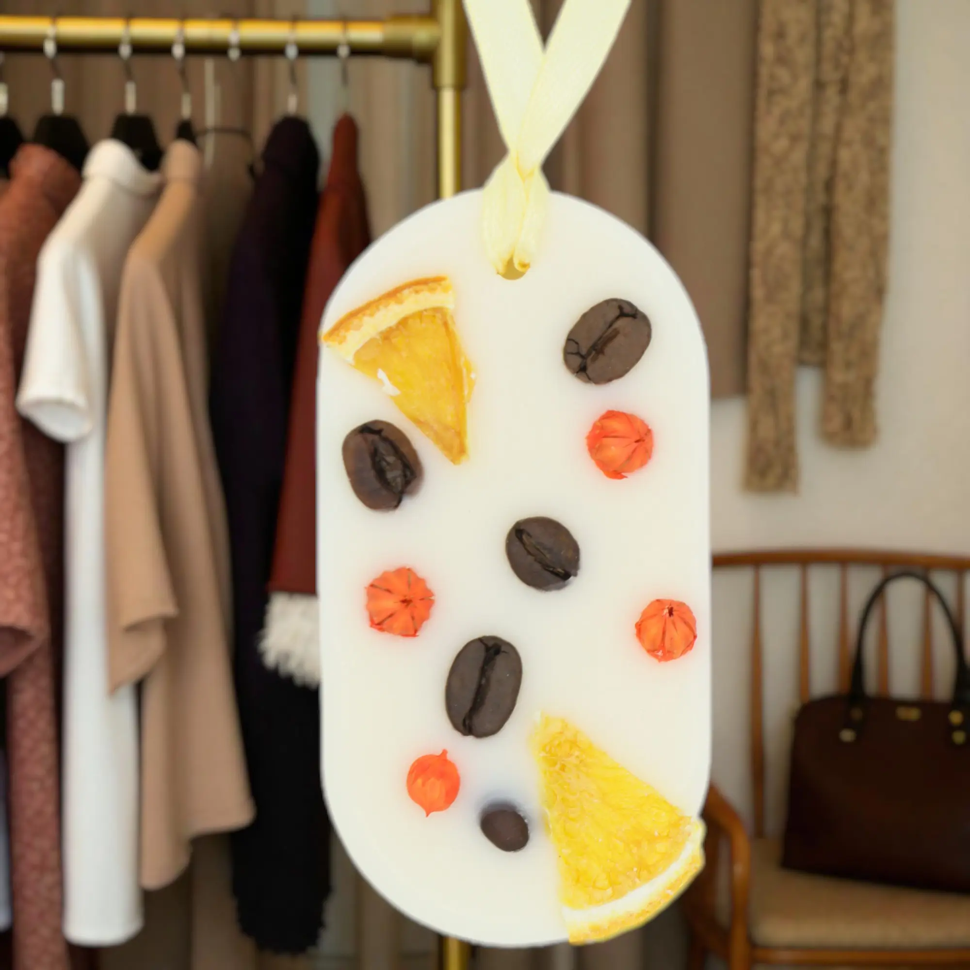 Fiecare odorizant este lucrat manual cu 100% ceară de soia, ulei parfumant și decorate cu flori și fructe uscate.